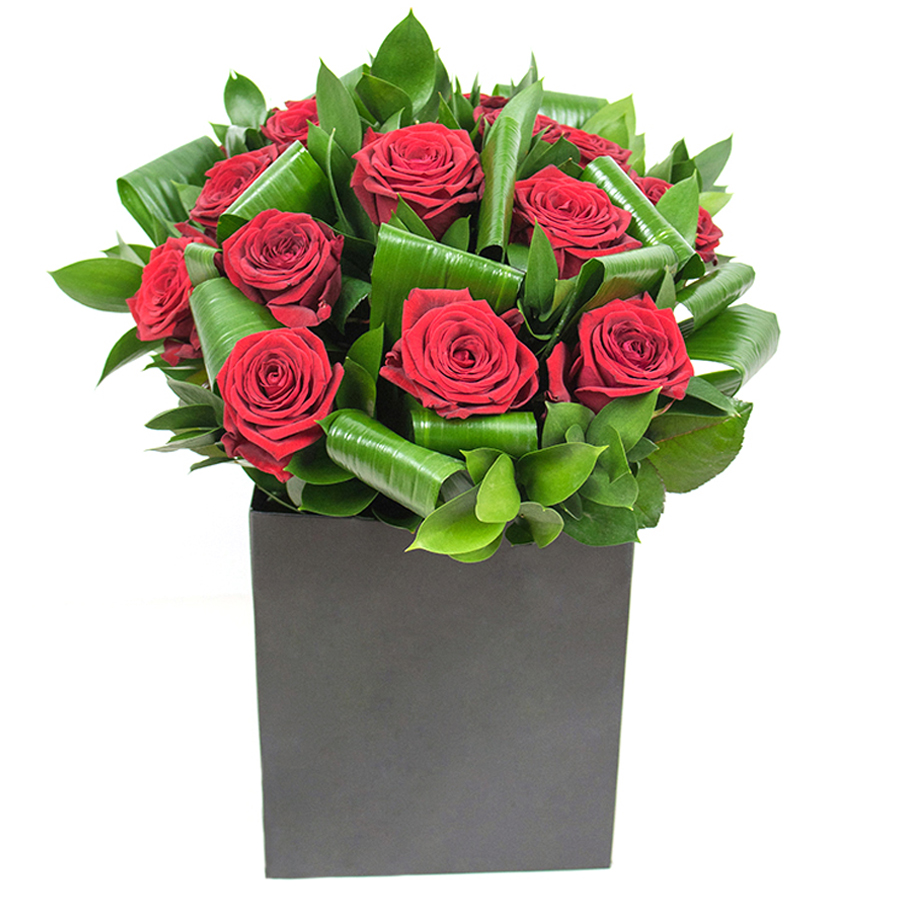 Experience the timeless beauty of our stunning red rose bouquet, expertly paired with lush aspidistra leaves and delicate ruscus. This unique arrangement adds a touch of sophistication and elegance to any space.